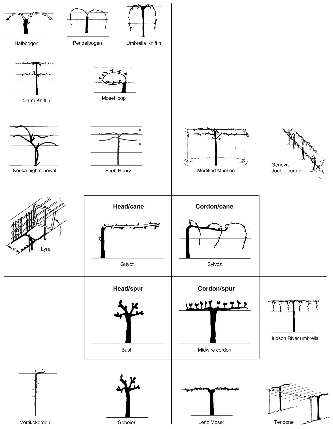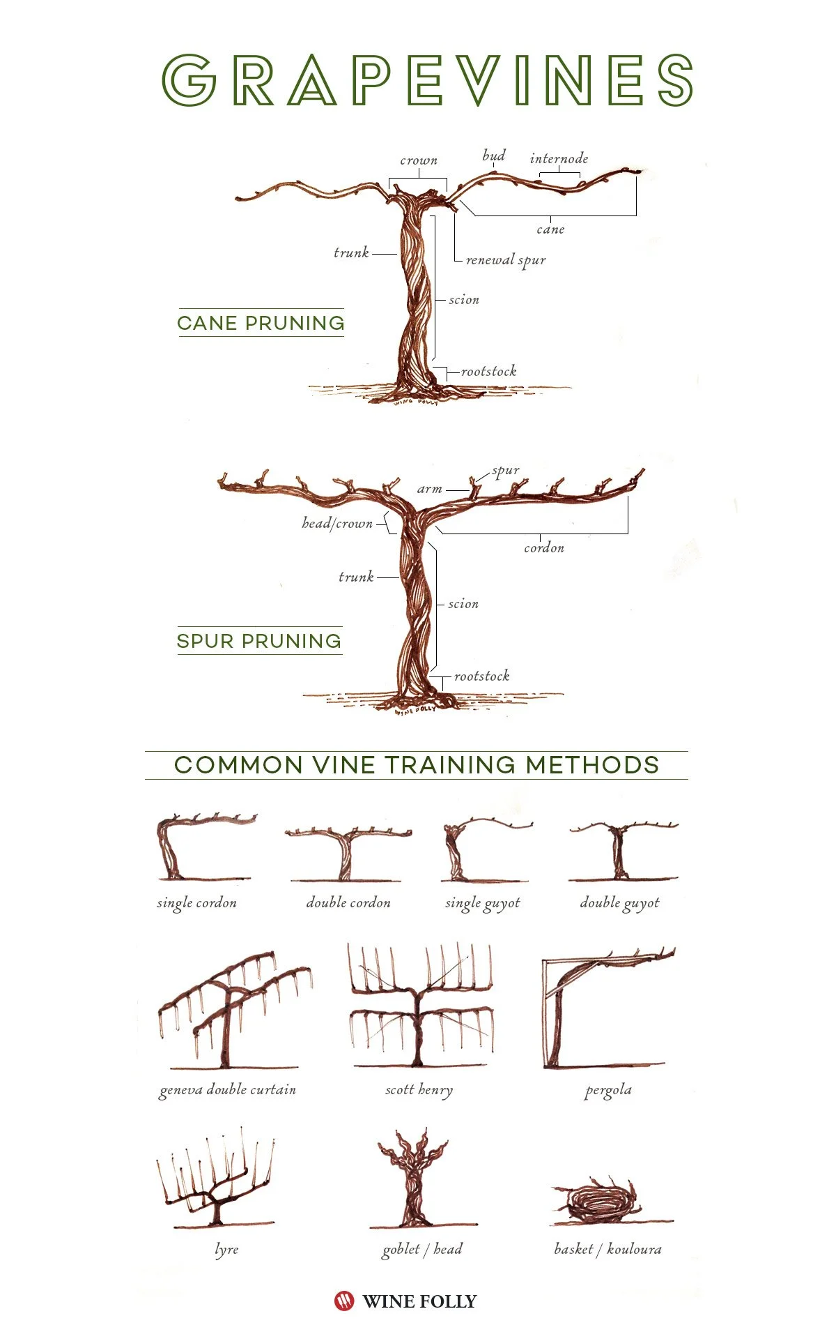 재미있는 것은, 포도나무 관리의 묘미가 바로 여기 숨겨져 있단 점이다. 포도나무는 넝쿨과로 유연한 몸체를 가지고 있기 때문에, 다른 과일나무들과 달리 농부가 어떻게 프루닝을 하느냐에 따라 몸체의 모양(수형 樹形)이 완전히 변할 수 있고, 그에 따라 열매의 맛과 생산량이 완전히 달라질 수 있다. 요컨대, 사과나무같은 두꺼운 나무들은 농부가 가지치기나 수형관리를 해도, 나무의 모양 자체를 바꿀 수 없다. 하지만 포도나무는 농부가 가지치기 방법에 따라 몸통(trunk)이나 원가지(cordon)을 나무처럼 두껍게 만든다거나 혹은 작게 만들 수도 있고, 가지를 한쪽 방향으로만 낸다거나 한 줄 혹은 두 줄 이상의 정렬로 하거나, 위로 솟은 나무 모양 혹은 엉켜진 넝쿨 모양 등 농부가 원하는대로 만들 수 있는 것이다. 이러한 프루닝은 포도나무가 심겨있는 토양의 양분과 지형, 나무의 수세(樹勢)와 품종 특징 등을 모두 고려해 농부가 선택하는 것으로, 포도의 품질 뿐만 아니라 맛과 향을 결정짓는데 절대적인 요소다.