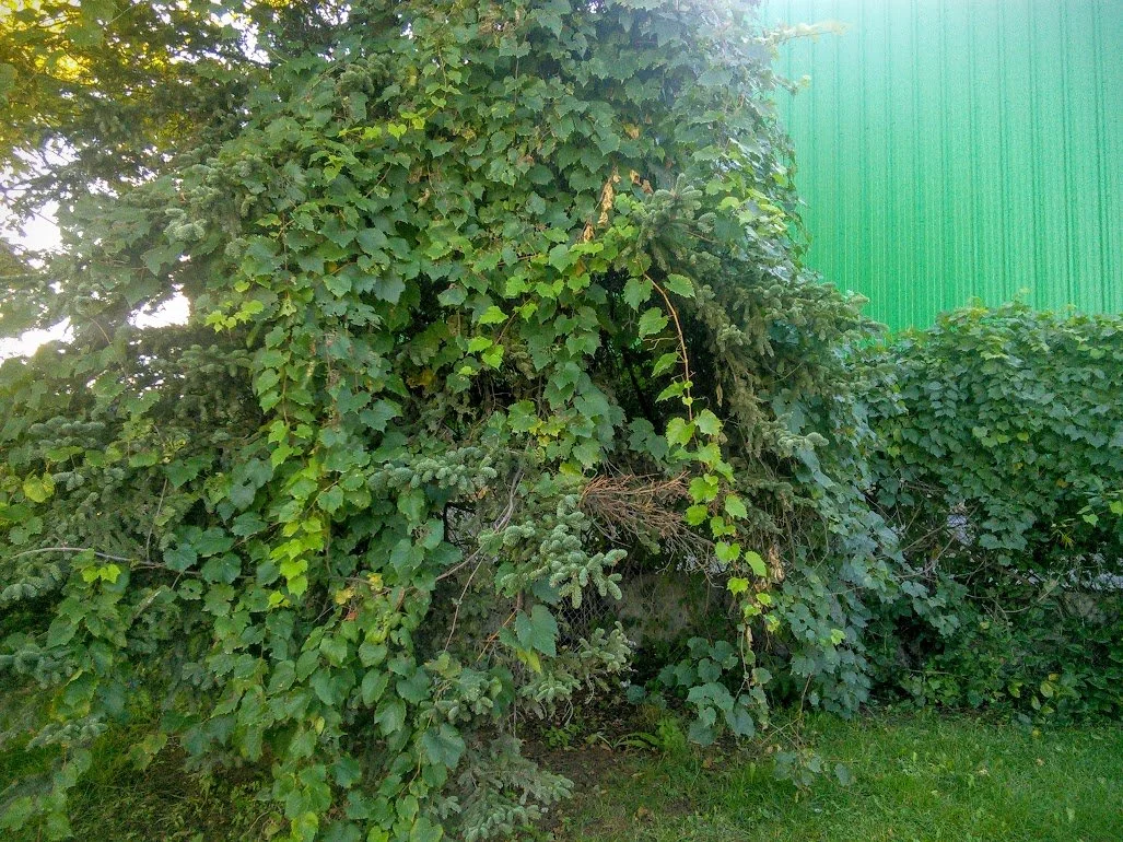 근처 나무를 타고 올라간, 잎이 무성하게 자란 야생 포도넝쿨